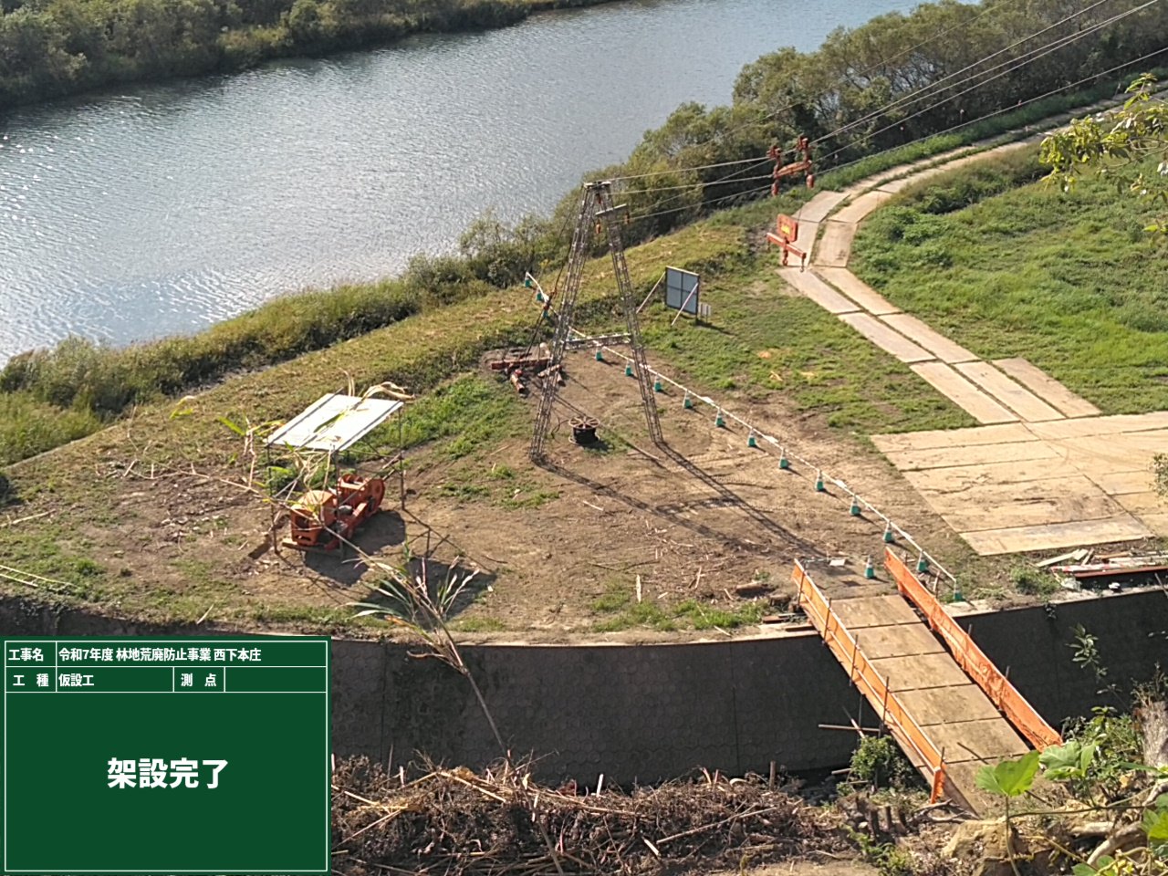 のり切が完了し、これから本工事の肝である法枠工+アンカー工を施行します。そこで、資材を斜面上部へ運搬する必要があるため索道を設置しました。引き続き安全第一で工事を進めていきたいと考えています。
