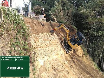 施工箇所は急勾配な山腹斜面で、はじめに竹などの雑木を伐採し、その後安定勾配でのり切を行いました。のり切については斜面が急峻であるため、無人掘削機を活用しました。複数のワイヤーで機械を吊り下げ、リモコンの遠隔操作により作業を行いました。